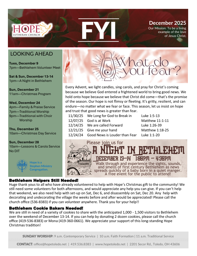 Hope Lutheran Church is a busy community of people living out our faith through worship, service, study, and fellowship.