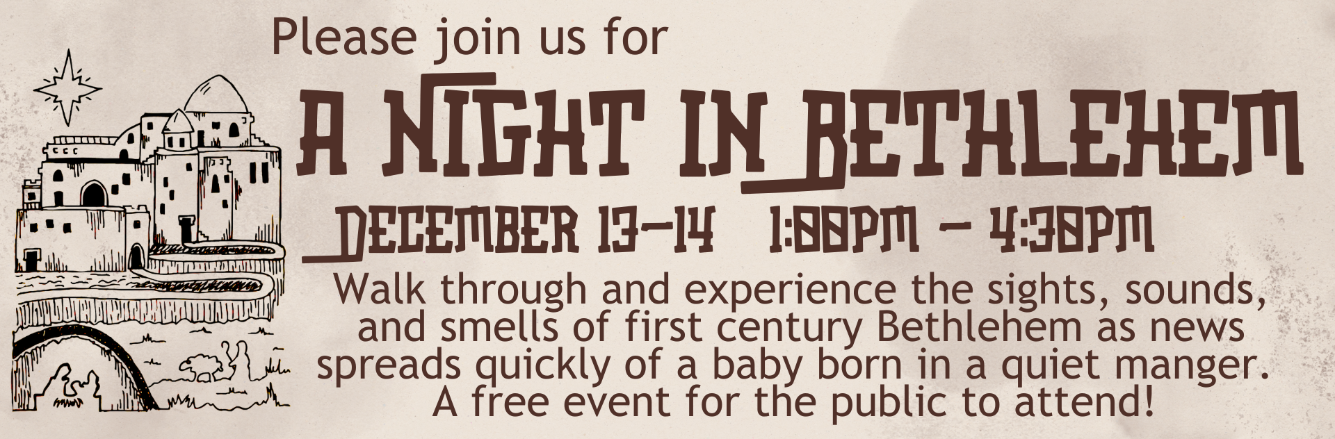 You are invited to come experience the sights, sounds, and smells of first century Bethlehem.
